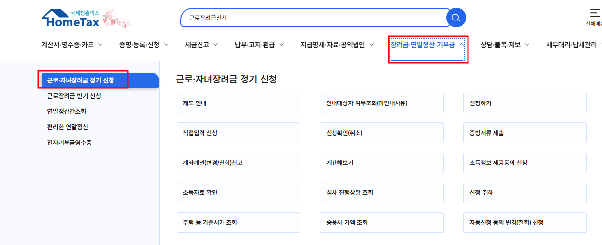 - 경로: [장려금·연말정산·전자기부금] → [근로·자녀장려금 신청].