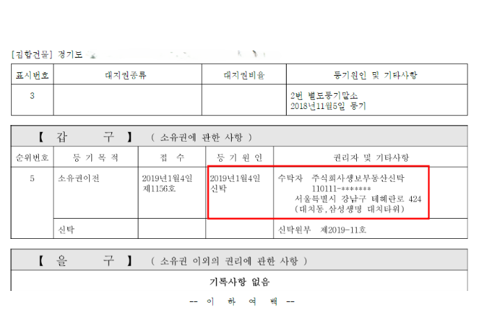 즉, 부동산의 명의가 소유주(위탁자)가 아닌 신탁회사로 등록됩니다.